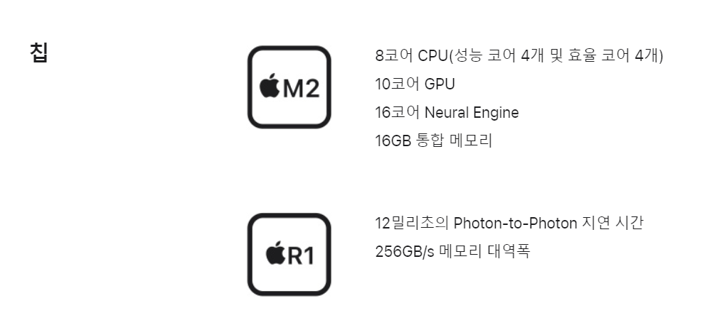 애플 비전프로는 부드러운 팬에 의해 냉각되는 센서 입력 처리를 위해 헤드셋용으로 특별히 제작된 애플 M2 프로세서와 새로운 애플 R1 프로세서를 사용합니다.