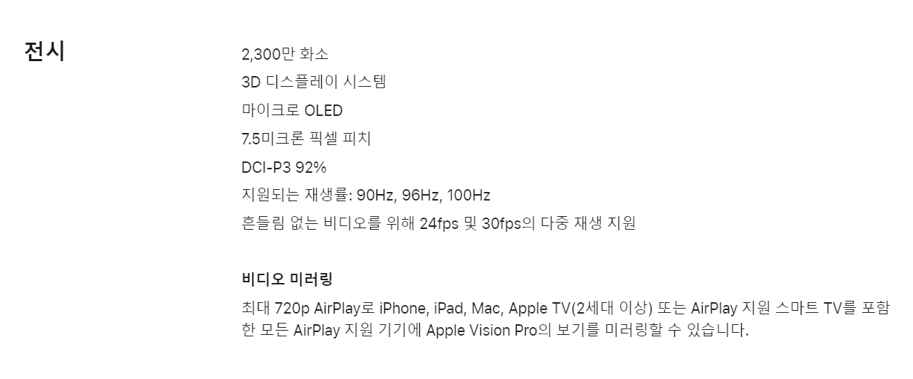 애플 비전프로는 2,300만 화소로 3D 디스플레이 시스템, 마이크로 OLED 화면을 지원합니다. 그래서 선명도와 시인성이 높습니다. 흔들림 없는 비디오를 위해 24 fps 및 30 fps의 다중 재생 지원합니다. 그리고 비디오 미러링을 지원하기 때문에 애플 TV 또는 AirPlay를 지원하는 스마트 TV에서도 미러링 할 수 있습니다.
