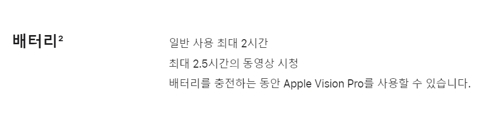 애플 비전프로는 케이블을 통해 헤드셋에 연결된 맞춤형 패킷 배터리를 사용하면 장치를 최대 2시간 사용할 수 있습니다. 또한 헤드셋을 외부 전원 공급 장치에 연결할 수 있습니다.