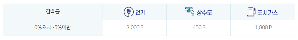 - 유지 인센티브 : 2회 이상 연속으로 5% 이상 감축하여 인센티브를 받은 참여자가 이어서 0% 초과 ~ 5% 미만의 감축률을 유지할 경우 지급