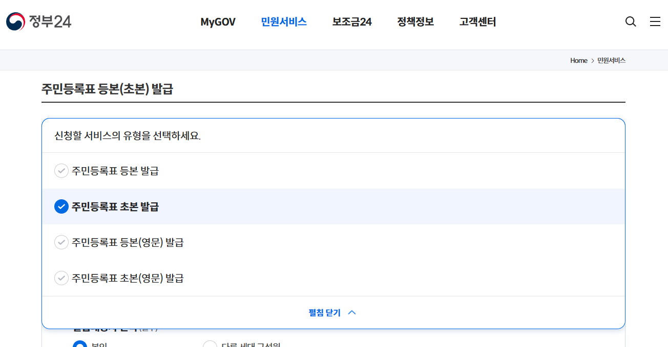 다만 주민등록등본 발급하는 화면에서 다른 유형 펼쳐보기를 하면, 아래와 같이 선택할 수 있습니다.