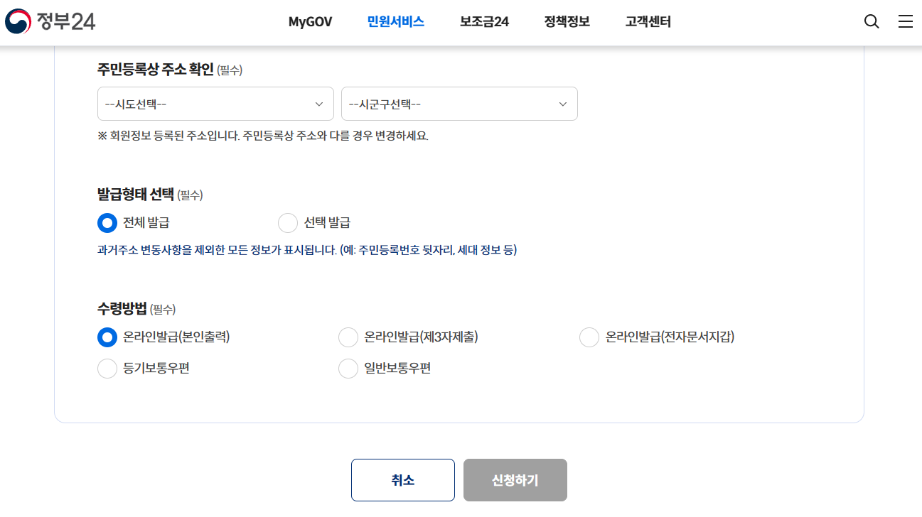 주민등록초본 발급, 주민등록등본(영문) 발급, 주민등록초본(영문) 발급 등 본인이 원하는 유형에 맞게 선택하여 발급받으시면 됩니다.