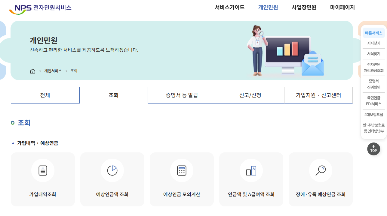 1) 위 파란색 버튼을 클릭하여 국민연금공단에서 운영하는 NPS전자민원서비스 홈페이지로 들어갑니다.